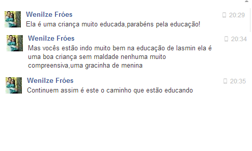 Temos recebido muitos elogios à nossa menina e isso me encanta: da doçura, da calma, da educação, da obediencia... agradeço demais à Deus e à Nossa Senhora que me ajudam nessa sublime missão e conitnuo pedindo sabedoria, discernimento e pridência para que nunca perca o equilibrio e a força de tranformar a minha menininha numa grande mulher!